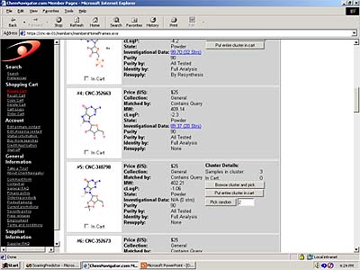 After hitting the search button, users view what appears to be a catalog page but which, according to Tad Hurst, ChemNavigator's chief scientific officer, is like no other catalog page you'll ever see. "We prefer to call it a hit list," Hurst told DrugDiscovery Online. "Users can now pick the compounds they want and take advantage of extensive cross-referencing to other compound sets and literature citations."