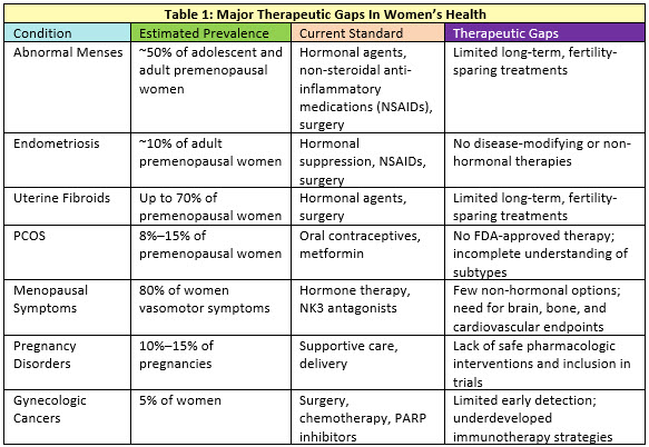 Significant therapeutic gaps persist across the spectrum of women’s health needs (Table 1). Gynecologic disorders, such as endometriosis, uterine fibroids, and polycystic ovary syndrome (PCOS), tend to affect women at younger ages. These conditions are characterized by long delays to diagnosis and have few efficacious therapies. 21 Autoimmune diseases disproportionately affect women and are also often diagnosed in younger women after significant delays. Many lack sex-specific treatment strategies despite differences in disease presentation and progression between men and women. Common symptoms of these disorders that affect premenopausal women include pain and infertility, which often interfere with educational attainment, caregiving, and workplace productivity. 22 The imbalance between burdens of disease and investment is clear — many of these disorders lack therapies that address the underlying pathophysiology.