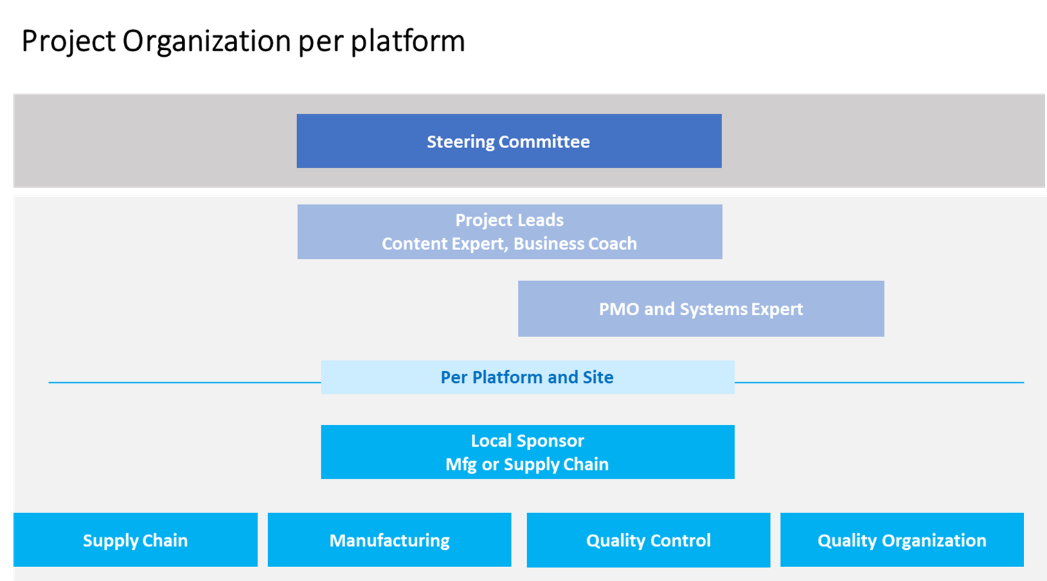 Implementation of the project was conducted with a “bottom-up” approach. A clear focus was put on involving and enabling each local platform team. Teams included members from the following functions: supply chain, manufacturing, quality control, and quality assurance.