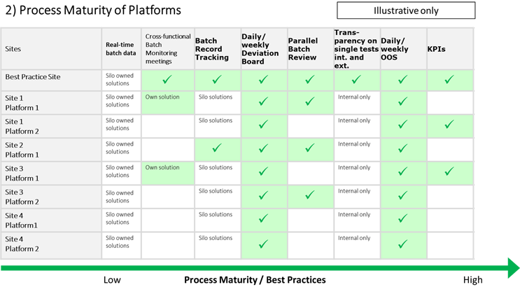 A global kickoff assured the dissemination of knowledge and stakeholder engagement of platform leads. Subsequently, the central implementation team worked with each platform lead (local implementation champion) to define the local cross-functional team and work toward a platform-specific solution. This included defining the high-level process, handover, and data points, customizing the batch monitoring solution, and coaching teams on implementing their cross-functional batch monitoring meetings and continuous improvement process.