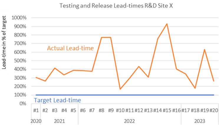 Example: The following platform’s testing and release process times illustrate the outcome of a typically silo-oriented project. Lead times fluctuate high above the target and don’t show a downward trend. Single lead times are above one year.