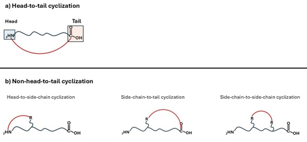 - Side-chain-to-tail cyclization: bond formation between a side-chain functional group and the C-terminal carboxyl group.