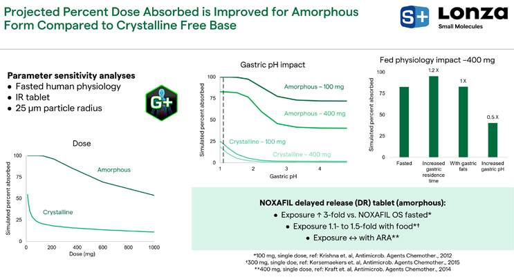 Given the predicted absorption risks highlighted above, including poor oral absorption in the fasted state and the potential for gastric pH-dependent ARA and food effects, we investigated mitigation strategies. We considered using an amorphous form of posaconazole and opted to use our custom in vitro solvent shift UV assay to measure the posaconazole amorphous solubility. We found a 30-fold enhancement in the amorphous compared to the crystalline solubility in intestinal media with bile salts representative of fasted humans. This prompted us to evaluate the amorphous form as a possible strategy for solubility enhancement and improved absorption. We did another set of PSAs using the same GastroPlus® model. In the lower left-hand corner of Figure 12, the graph shows that simulated percent absorbed is substantially increased using an amorphous form over a relatively large dose range.