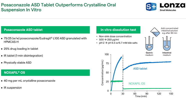 Based on these projections, a posaconazole ASD amorphous solid dispersion tablet was developed. We had a relatively high drug loading (75%) in an Eudragit® amorphous solid dispersion that was granulated with hydroxypropyl methylcellulose acetate succinate (HPMCAS-H) to maintain supersaturated drug concentrations and get a high drug loading on the tablet (25%). Looking at an immediate release tablet with rapid disintegration and the physical stability under accelerated conditions, we found the ASD to be physically stable. On the right side of Figure 13, the ASD tablet and NOXAFIL OS® suspension are compared in a gastric to intestinal transfer in vitro dissolution test under non-sink conditions. The ASD tablet outperformed NOXAFIL OS® by maintaining supersaturation at the amorphous solubility for the duration of the test.