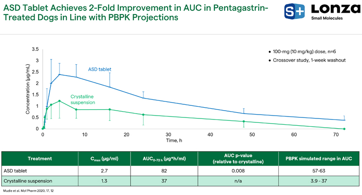 After conducting an in vivo study in fasted beagle dogs who had been administered pentagastrin to reduce their stomach pH to 1 to 2 pH, the ASD tablet outperformed the crystalline suspension in terms of area of the curve by twofold (Figure 15). Our PSAs projected this, but since it was only a twofold enhancement, it is likely that the stomach pH of the beagle dogs was closer to 1 and precipitation time of posaconazole was relatively long, meaning that super saturation may have been achieved for about 1 hour. As such, the ASD tablet outperforms posaconazole in ideal state conditions, i.e., with a reduced stomach pH. We would expect a higher magnitude of exposure increase under higher gastric pH conditions (e.g., in the presence of an ARA).
