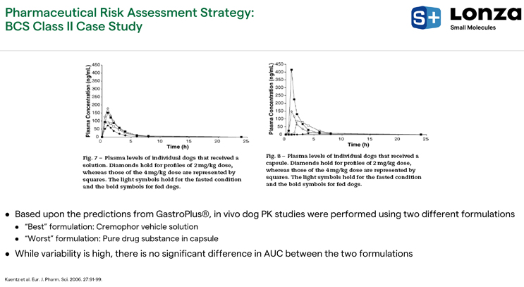 Roche validated what they saw from these analyses and went into dog studies where they developed multiple formulations. The “worst formulation” was pure drug substance in the capsule, demonstrated in the Figure 5 plot on the right. The “best formulation” was the Cremaphor vehicle solution where they tried, as best as possible, to put the drug in solution to improve the bioavailability (Figure 5, left). When accounting for variability effects, the area under the curves (AUCs) were similar between these formulations. There wasn't any added benefit of the vehicle solution path, which reflects the results of the PSA.