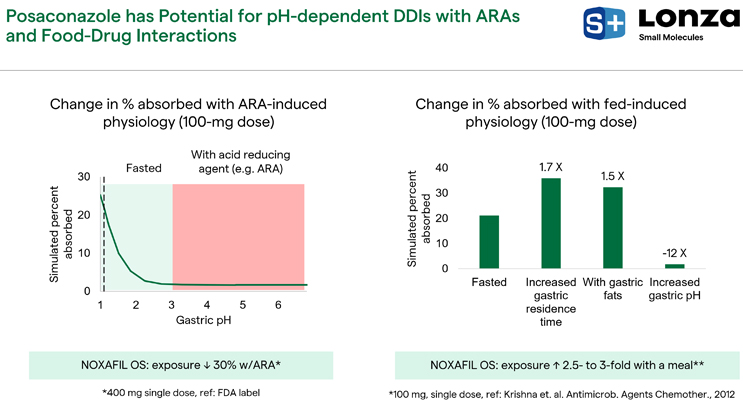 We considered the potential for posaconazole to have pH-dependent drug interactions with ARAs and food. The left graph of Figure 11 demonstrates simulated percent absorbed as a function of gastric pH at a 100-milligram dose. When patients are taking ARAs, their gastric pH ranges from about 3 to 7; in this pH range, the simulated percent absorbed is significantly reduced compared to the fasted state. Data for NOXAFIL OS® indeed shows that exposure is reduced by 30% with an ARA, demonstrating a pH-dependent drug interaction with this molecule, demonstrating the validity of these predictions.