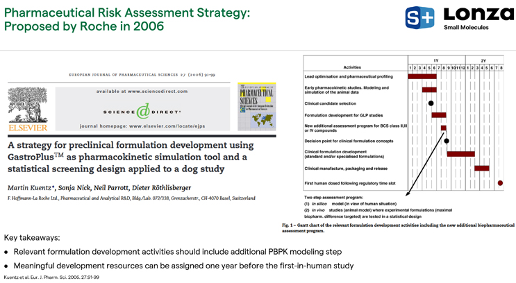 Over the years, more publications have been released, leading to updated model-building strategies to help support in-human predictions. Many studies include suggestions on how scientists in different stages of projects could start using PBPK to help make better informed decisions. Roche published useful guides almost 20 years ago that outlined their strategies for incorporating PBPK modeling as a standard procedure for all programs, including a chart outlining when modeling and simulation were being used in preclinical development to help select clinical formulation concepts for their first-in-human studies (Figure 3). In a publication from 2006, Roche examined a case study for a BCS class II drug, where, based upon the Biopharmaceutics Classification System (BCS)assessment, there were suggestions internally to utilize solubility enhancement approaches to improve the oral bioavailability of this drug in dogs (Figure 3).