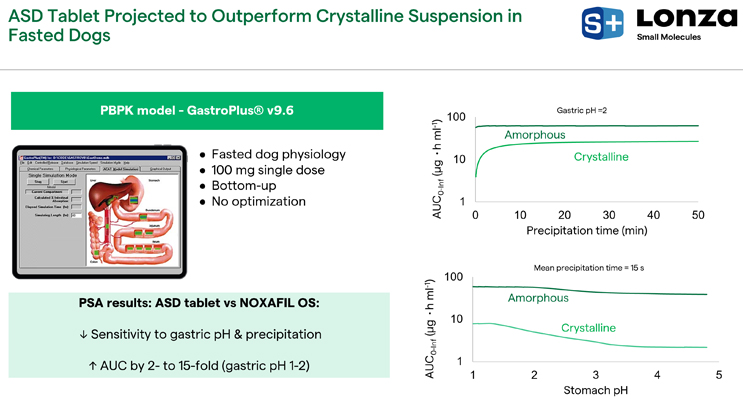 Next, PBPK modeling was used to de-risk an upcoming preclinical dog study by looking at two formulations, the ASD tablet and NOXAFIL OS®. In addition to the in vitro measured solubilities and API structure, we used observations from the dissolution test, Caco-2 permeation data, and in vivo IV bolus data from the literature to ground our permeation rate in dogs and understand our clearance and volume of distribution to predict plasma profiles. ADMET Predictor® and GastroPlus® were utilized to generate the following outputs: predicted plasma exposure, amorphous enhancement, and sensitivity to physiological and formulation variables.