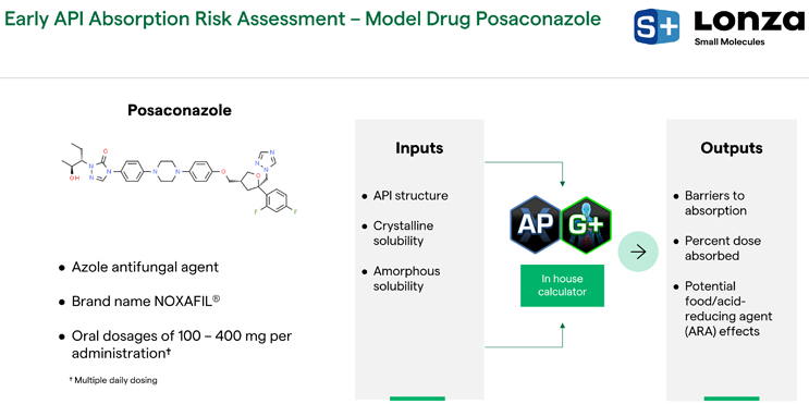 This case study emphasizes the impact of early API absorption risk assessments prior to obtaining preclinical data. In this exercise, we conducted an early API absorption risk assessment using model drug posaconazole. Posaconazole is an antifungal agent whose brand name is NOXAFIL®. It has oral dosages of 100 to 400 milligrams per administration and is dosed multiple times per day. Our inputs for this exercise were the API structure and in vitro crystalline and amorphous solubilities (Figure 8). That information was placed into the ADMET Predictor® and GastroPlus® with an in-house calculator to predict barriers to absorption, percent dose absorbed, and potential food or ARA effects.