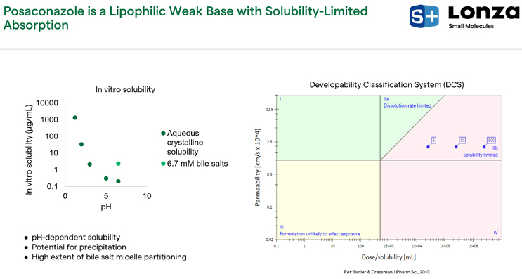 Based on structure and solubility, we learned that posaconazole is a lipophilic weak base with solubility limited absorption. In Figure 9, the left plot demonstrates that solubility decreased as a function of pH, which drives a potential for precipitation as this drug moves from the stomach into the small intestine. It also has a high amount of bile salt micelle partitioning; the endogenous bile salt micelles in the gastrointestinal tract act to solubilize the drug. There was a 12-fold enhancement in solubility with 6.7 millimolar of bile salts in the media, which is representative of fasted state media. Per the developability classification system, posaconazole has a relatively high permeation rate, but it also has a high ratio of dose to solubility (Figure 9). Since it is over the dose range of 5 to 500 milligrams, it’s in the solubility limited regime and solubility is a barrier to absorption.