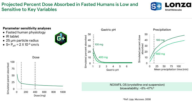 Next, PSAs were conducted using GastroPlus®, simulating a fasted human physiology, an immediate release tablet with relatively small particle size, and the Simulations Plus predicted permeation rate (S+Peff = 2 X 10-4cm/s). In Figure 10 on the lower left side, the simulated percent absorbed is relatively low: 25% absorption at doses greater than 100 milligrams. Therefore, we flagged an absorption risk for low bioavailability. On the right-hand side of Figure 10, gastric pH and precipitation of posaconazole when it enters the small intestine are both crucial factors due to large impact on simulated percent absorbed. When gastric pH is increased, there is a significant reduction in the percentage absorbed. However, when we simulate a relatively long precipitation time and achieve super saturation for a long duration, that impacts absorption as well. Overall, the percentage absorbed was in the range of 2% to 50%, which adequately predicts the behavior of the marketed NOXAFIL® oral suspension (OS) of posaconazole, which has an estimated bioavailability around 8% to 47% over the prescribed dose range. Posaconazole is believed to have a relatively low first pass extraction, and therefore bioavailability is indicative of the percent absorbed. By using the API structure and the measured crystalline solubility profile alone, these outcomes were well predicted.