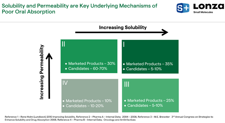 Solubility and permeability are the key underlying mechanisms of poor oral absorption. BCS II and IV compounds have poor solubility in gastrointestinal fluids at (at least) one of their prescribed dosages, and BCS III and IV compounds have poor permeability (Figure 6). Compounds with poor solubility make up a large fraction of drug candidates in development, ranging from 70% and higher (Figure 6).