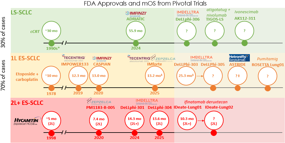 Figure 1. Abbreviations: cCRT (concurrent chemoradiation therapy). Key: *cCRT is not regulated by the FDA. cCRT was introduced in the early 1990s and cemented by the late 1990s–early 2000s. § Overall survival (OS) was measured from point of maintenance treatment (following induction therapy). ⱡ ASTRIDE is an ongoing Phase 3 U.S.-bridging trial to seek FDA-approval. Phase 3 ASTRUM-005 with trials sited in China and the EU yielded a median overall survival (mOS) of 15.4 months. Other notable pipeline assets are ABBV-706 (P3 SEZanne 1L ES-SCLC); ZL-1310 (planned P3 in 1L ES-SCLC); obrixtamig (P1 DAREON-8 1L ES-SCLC); and gocatamig (P1/2 2L+ ES-SCLC).